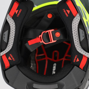 Zur Sicherheitsausstattung gehören ein leichter Doppel-D-Verschluss aus rot eloxiertem Aluminium sowie herausnehmbare, hypoallergene und atmungsaktive Innenpolster, die bei Bedarf gewaschen werden können. Die Soft-Touch-Stoffe leiten Feuchtigkeit effektiv ab. Das integrierte A.C.S. – Acerbis Comfort System sorgt mit elastischen Bändern und kleinen Gummi-Saugnäpfen für noch besseren Sitz und optimale Belüftung im oberen Kopfbereich.